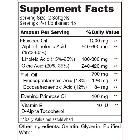 Alpha Linolenic Acid (45%-50%) 540-600mg, Linoleic Acid (15%-25%) 180-300mg, Oleic Acid (20%-35%) 240-420mg